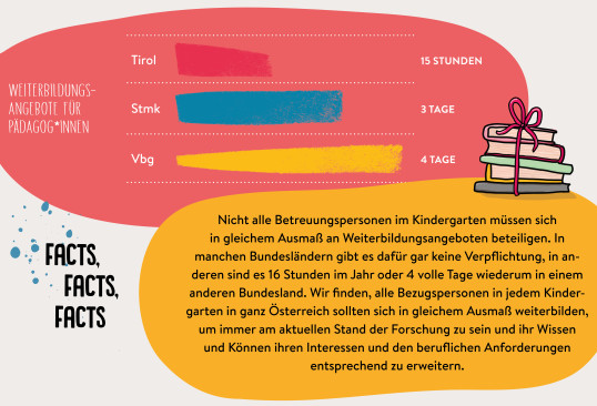 Damit die Bezugspersonen der Kinder bestens ausgebildet und immer auf dem aktuellen Stand der (pädagogischen) Forschung sind, braucht es neben bestehenden Weiterbildungsangeboten auch eine Verbesserung der Ausbildungsangebote. Zusätzlich brauchen alle Angestellten im Kindergarten nach 3 Jahren im Job die Möglichkeit einer 3-monatigen Bildungskarenz, um sich in Ruhe mit Fortbildung und Reflexion zu beschäftigen und danach mit neuem Wissen wieder in den Beruf zurückzukommen.